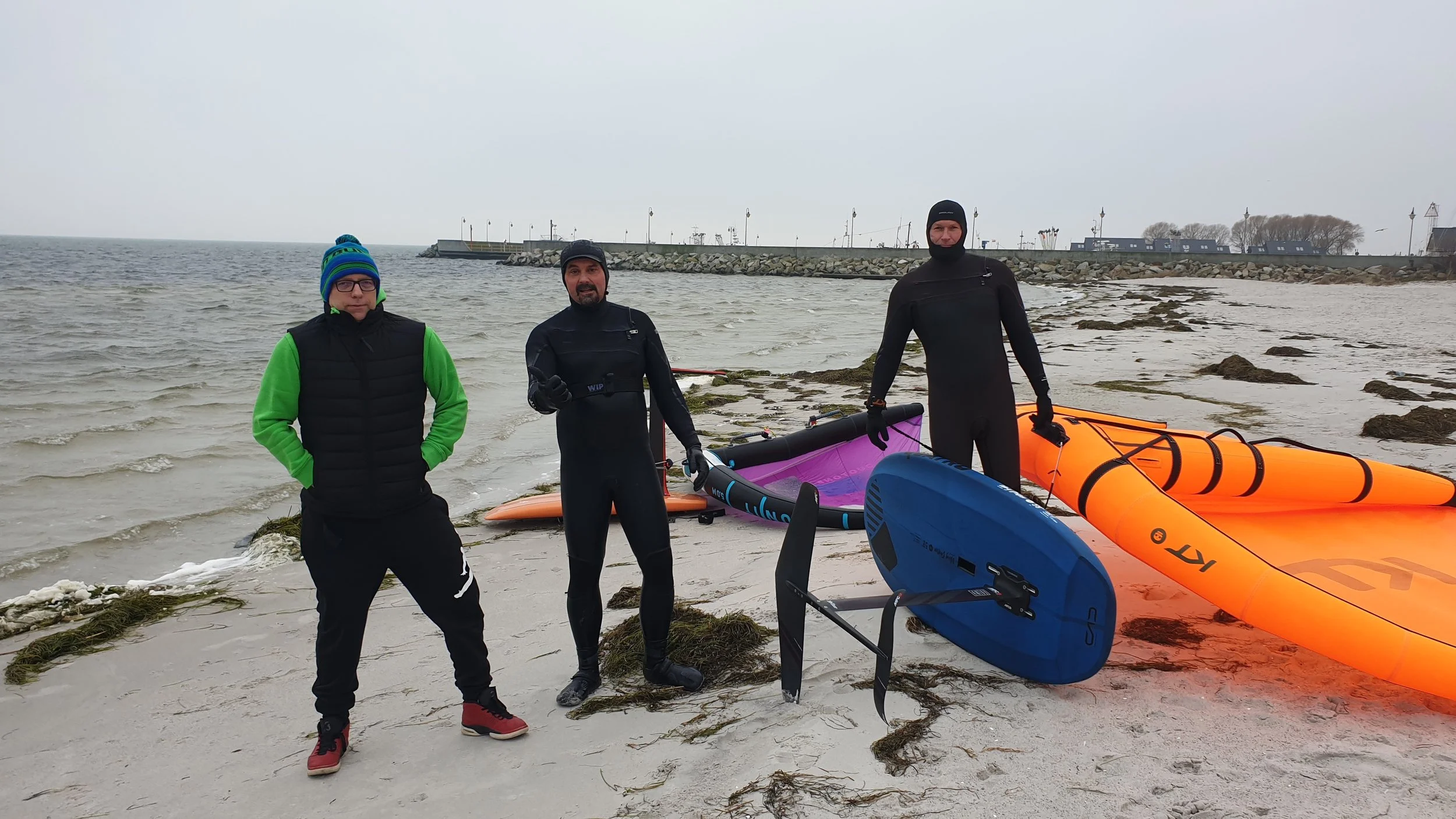 Korzystając z wyjątkowo łagodnej zimy, a wręcz rekordów odnotowanych temperatur (+18°C) o tej porze roku, udało się zorganizować grupę zapaleńców, którzy wzięli udział w testach i szkoleniach z zakresu pływania na Wingfoilu. Pierwsze spotkanie miało miejsce w Rewie w pierwszy dzień Nowego Roku. . Udało się przetestować małe rozmiary Wingów (3,5-4,5m) oraz różne długości masztów (65-92cm). Uczestnicy zdobyli wiedzę na temat doboru odpowiedniego sprzętu do umiejętności oraz warunków wiatrowych. Kolejne spotkanie miało miejsce 8.01.23 w Kuźnicy przy porcie rybackim. Mimo zdecydowanie chłodniejszego dnia stawiło się 5 śmiałków w tym jedna dziewczyna. Tym razem ćwiczyliśmy pływanie w przednich strzemionach, a osoby bardziej zaawansowane podejmowały pierwsze próby pływania w trapezie. Uczestnicy zdobyli również wiedzę na temat techniki halsowania się pod wiatr. W sumie w zajęciach uczestniczyło przez 2 dni 7 osób. Bardzo cieszy fakt, że poprzez takie inicjatywy oraz wydarzenia, zauważalnie wzrasta popularność dyscypliny co przekłada się na frekwencję na spotach. Przypomina to początki rozwoju pokrewnej dyscypliny, Kiteboardingu.